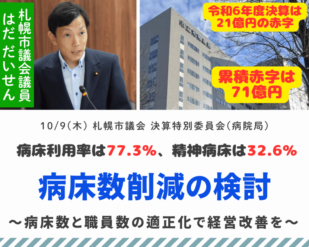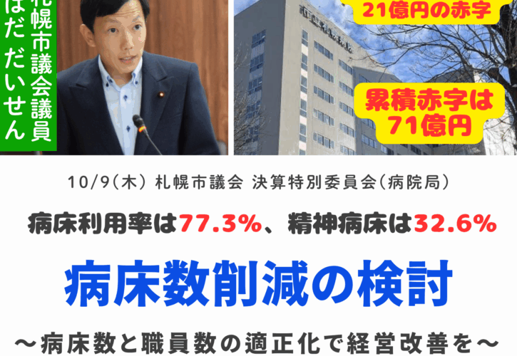 10/9(木)、札幌市議会 決算特別委員会(病院局)で「市立札幌病院の経営改善に向けた病床数削減の検討」について質問しました。
