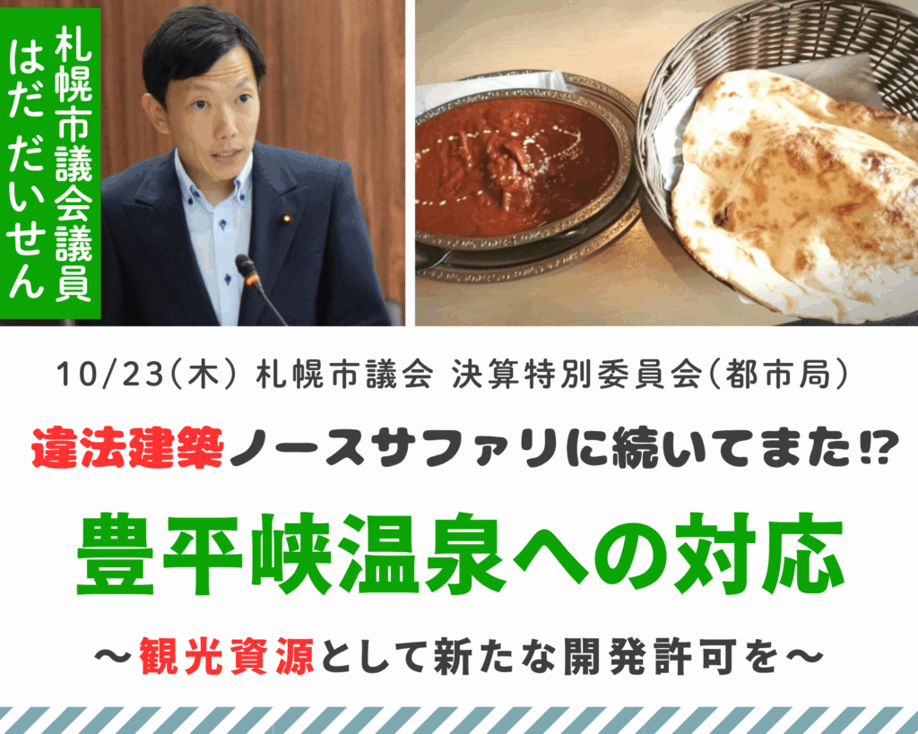 10/23(木)、札幌市議会 決算特別委員会(都市局)で「豊平峡温泉への対応」について質問しました。