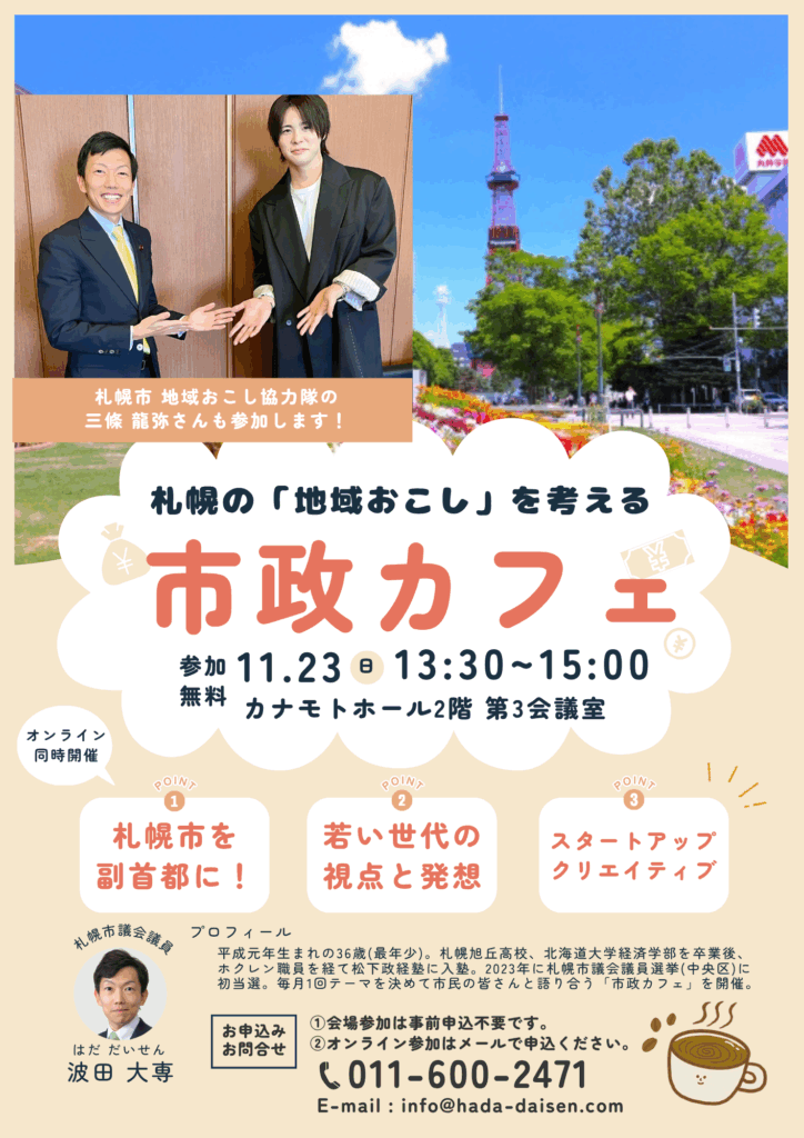#はだだいせん #波田大専 #日本維新の会 #札幌市議会 #北海道 #札幌市 #中央区 #平成生まれ #36歳 #子育て世代 #2児の父 #松下政経塾 #元ホクレン職員 #札幌旭丘高校 #行政書士 #社会福祉士 #地域おこし協力隊 #副首都構想 #市政カフェ
