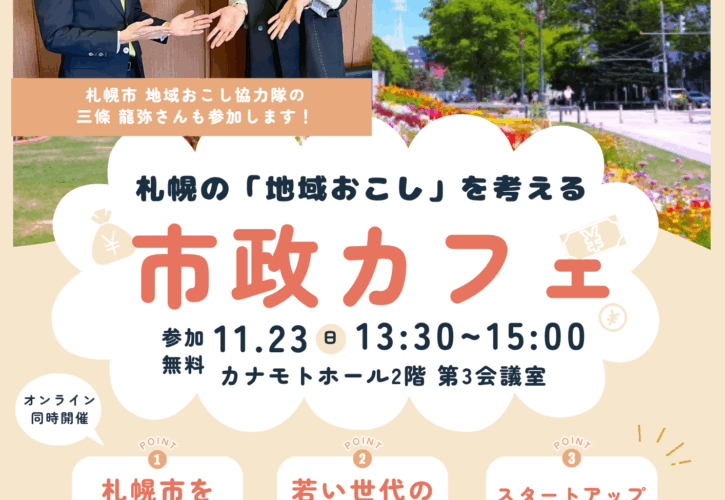 ・今回は、今年9月に札幌市で初となる「地域おこし協力隊」に着任された三條 龍弥さん(33歳)をゲストにお迎えし、「スタートアップ」「クリエイティブ」等、若い世代の視点や発想から札幌の「地域おこし」についてお話頂きます。