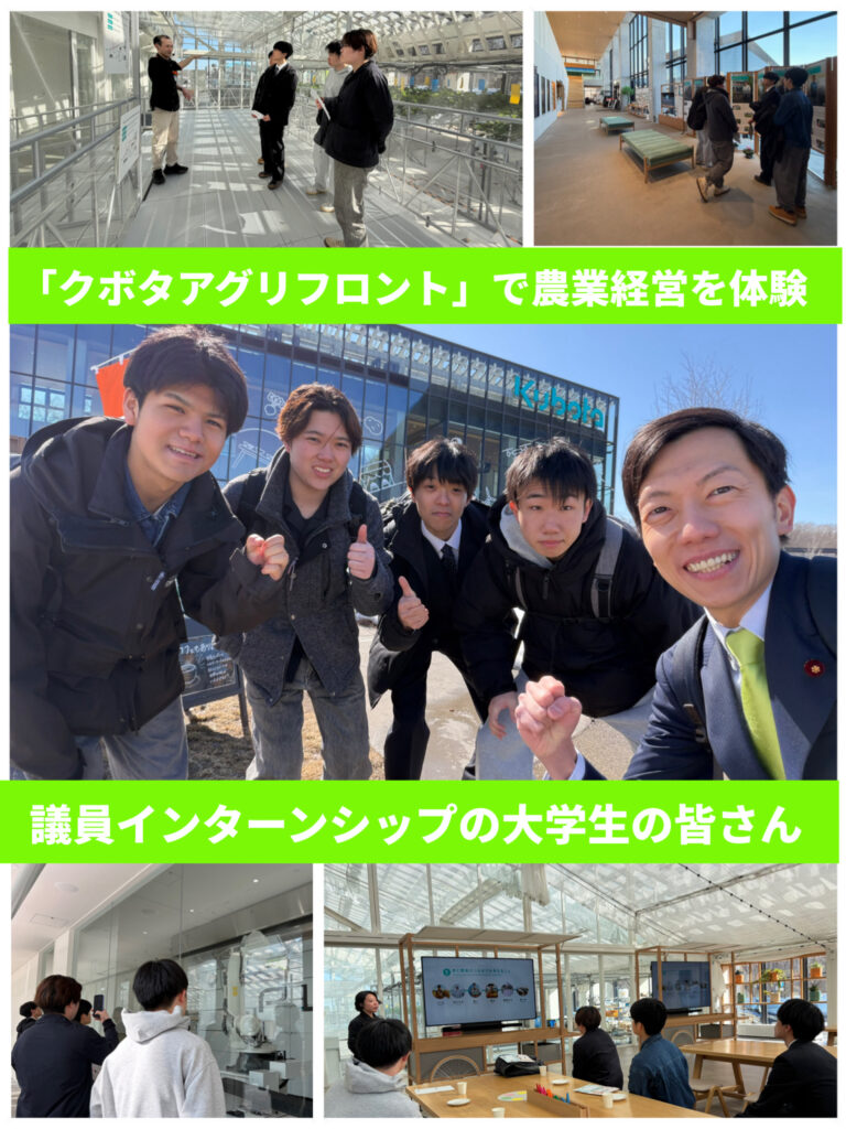 3/15(日)、議員インターンシップの大学生の皆さんと一緒に農業学習施設「クボタアグリフロント」を見学し、農業経営ゲーム「AGRI QUEST」を体験させて頂きました。