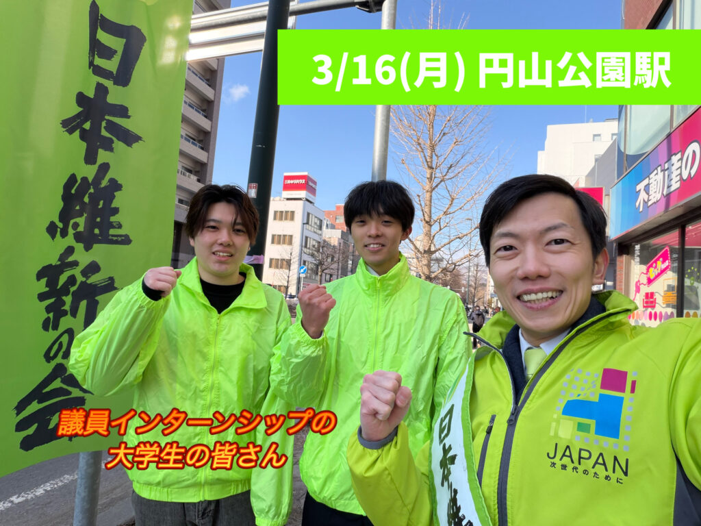 3/16(月)、議員インターンシップの学生さんと一緒に地下鉄「円山公園駅」前で朝のご挨拶をさせて頂きました。
