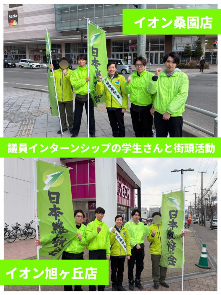 3/22(日)、イオン桑園店・イオン旭ヶ丘店様の前をお借りして街頭活動を行いました。