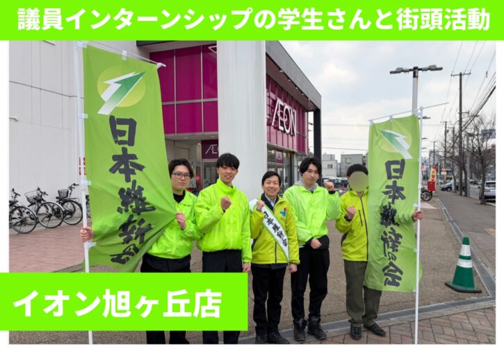 議員インターンシップの学生さん達と、日本維新の会の党員の方と一緒に、市政だよりをお配りしながら、市政報告と政策の一端をお訴えさせて頂きました。