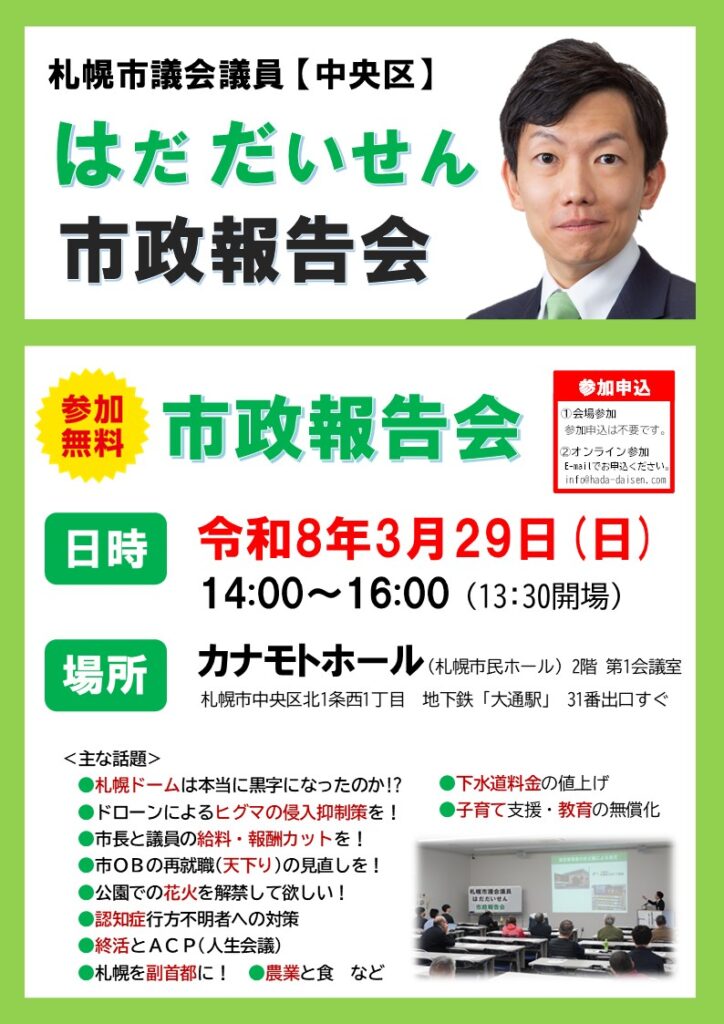毎年恒例の第3回「札幌市議会議員 はだ だいせん 市政報告会」を開催致します。