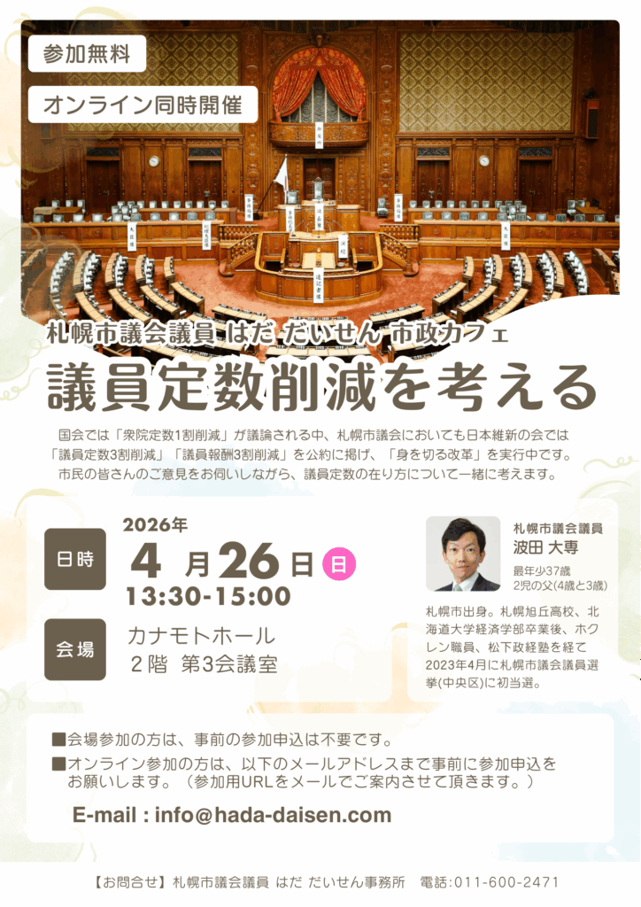 ・国会では「衆院定数1割削減」が議論される中、札幌市議会においても日本維新の会では「議員定数3割削減」「議員報酬3割削減」を公約に掲げ、「身を切る改革」を実行中です。